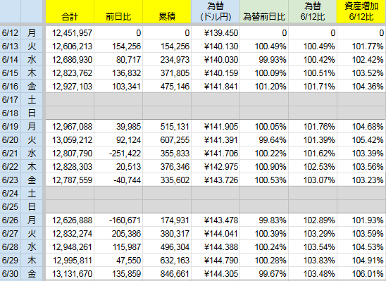 ブログをはじめましたので6月12日から株式資産の推移表を作りました。